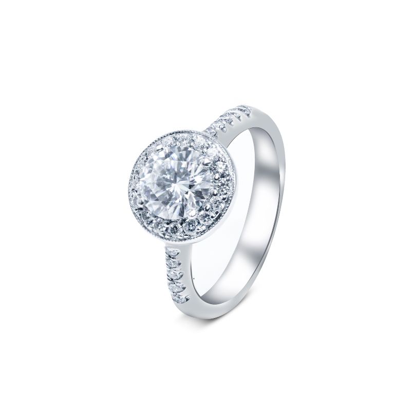One 18ct White Gold Halo ring set with a Round 6.5mm Moissanite and 26 Round Brilliant diamonds in claw set. 4.49gr 26<>0.26ct