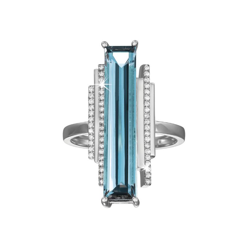 9ct White gold Dress ring set with an Emerald cut Sky Blue Topaz and small Round Brilliant diamonds in claw set 1<>5.65ct
