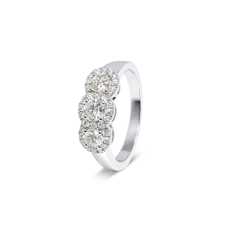 14ct white gold classic three stone halo ring with round brilliant diamonds 3<>0.52ct 30<>0.28ct 3.99gr Size M