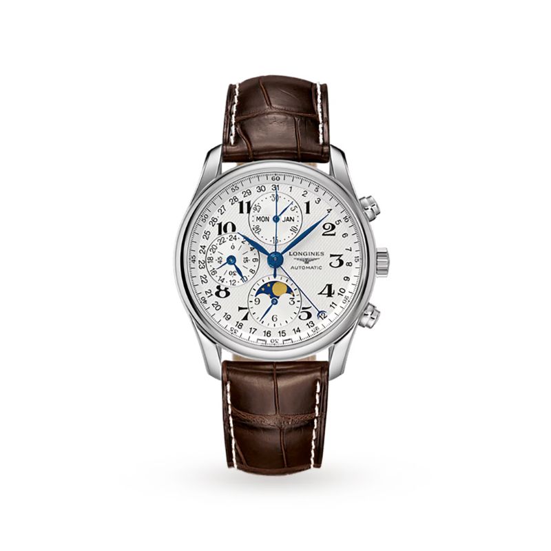 Longines Master Collection 40mm Moon Phase: Silver dial, stainless steel case, automatic movement, 300m water resistant with brown leather strap