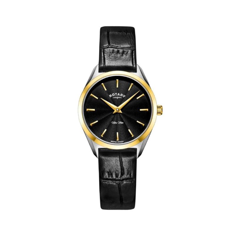 Rotary Ultra Slim: Black Dial, Stainless Steel two tone Case, Quartz Movement, Black Leather Strap