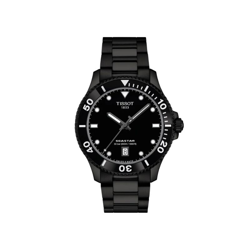 Tissot Seastar: Black dial, black stainless steel case, quartz movement, 300m water resistant with black stainless steel bracelet T1204103305100