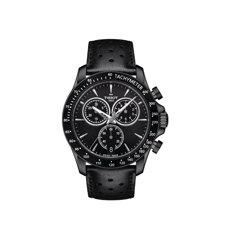 Tissot V8 Quartz Chronograph 42.5mm: Black dial, PVD coated stainless steel case, quartz movement, 100m water resistant with a black leather strap.